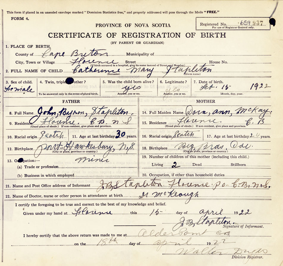 21. Name and Post Office address of Informant J. B. Stapleton Florence, Cape Breton