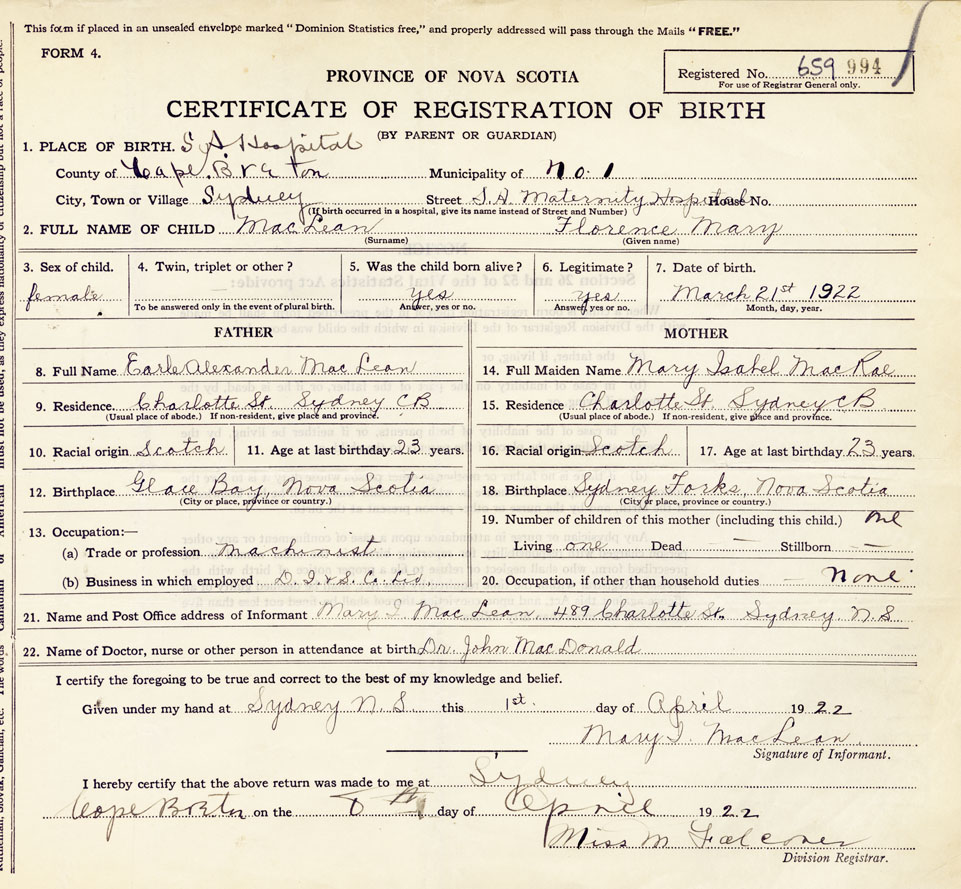 21. Name and Post Office address of Informant Mary I. MacLean 489 Charlotte St., Sydney