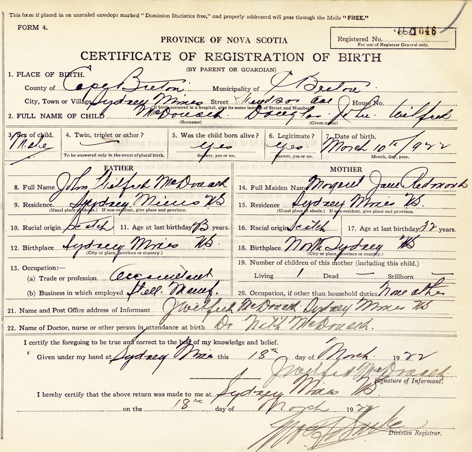 21. Name and Post Office address of Informant J. Wilfred McDonald Sydney Mines