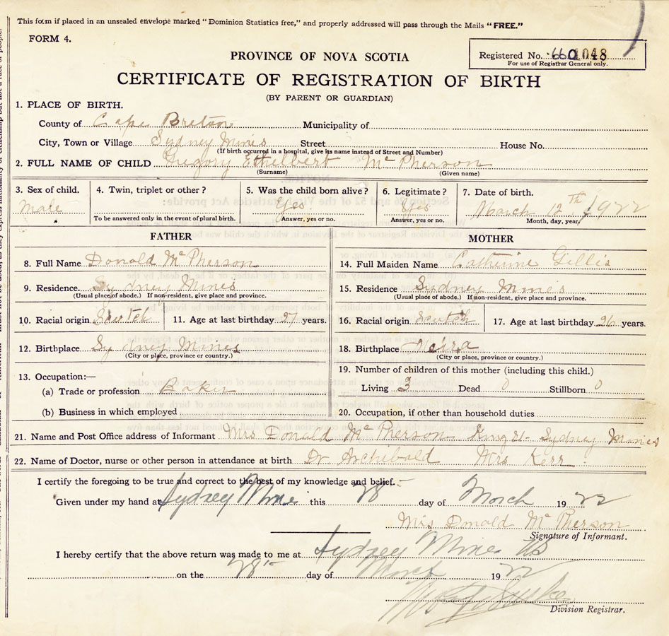 21. Name and Post Office address of Informant Mrs. Donald McPherson King St., Sydney Mines