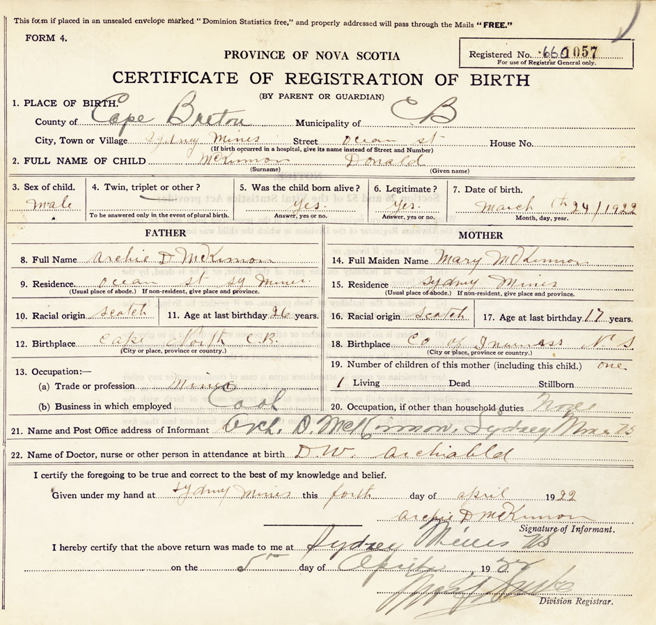 21. Name and Post Office address of Informant Archibald D. McKinnon Sydney Mines