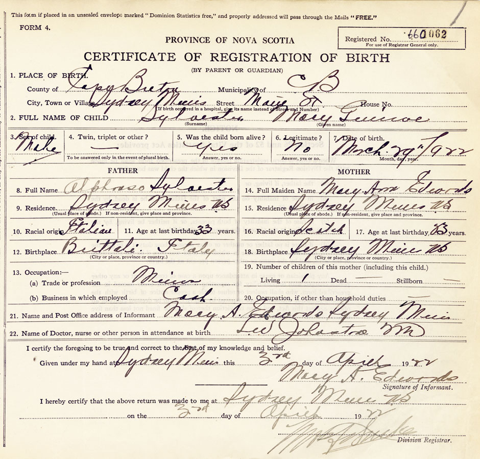 21. Name and Post Office address of Informant Mary A. Edwards Sydney Mines