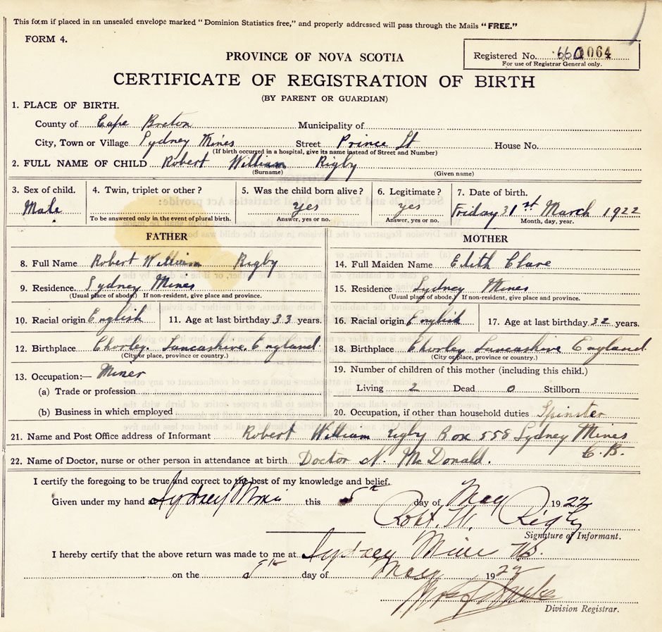 21. Name and Post Office address of Informant Robert William Rigby Box 558, Sydney Mines