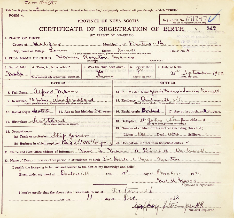 Birth Registration: Year: 1922 number: 67100247