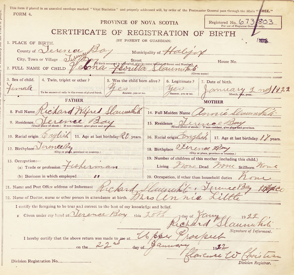 21. Name and Post Office address of Informant Richard Slaunwhite Terence Bay