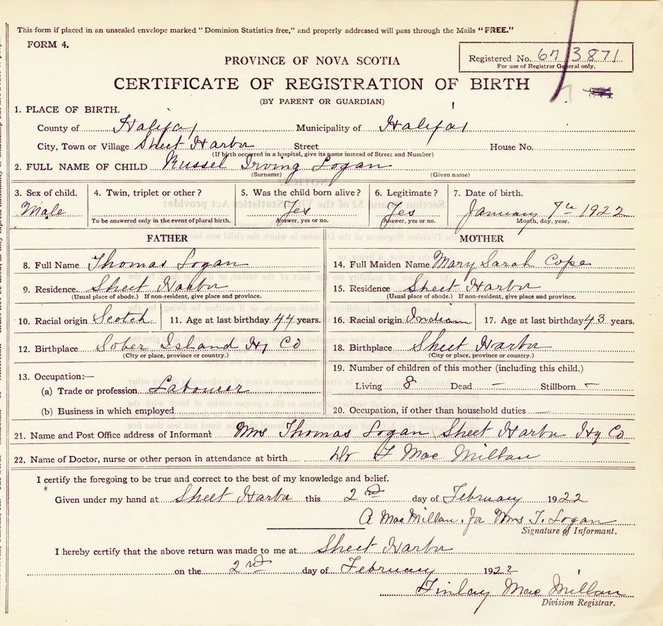 21. Name and Post Office address of Informant Mrs. Thomas Logan Sheet Harbour