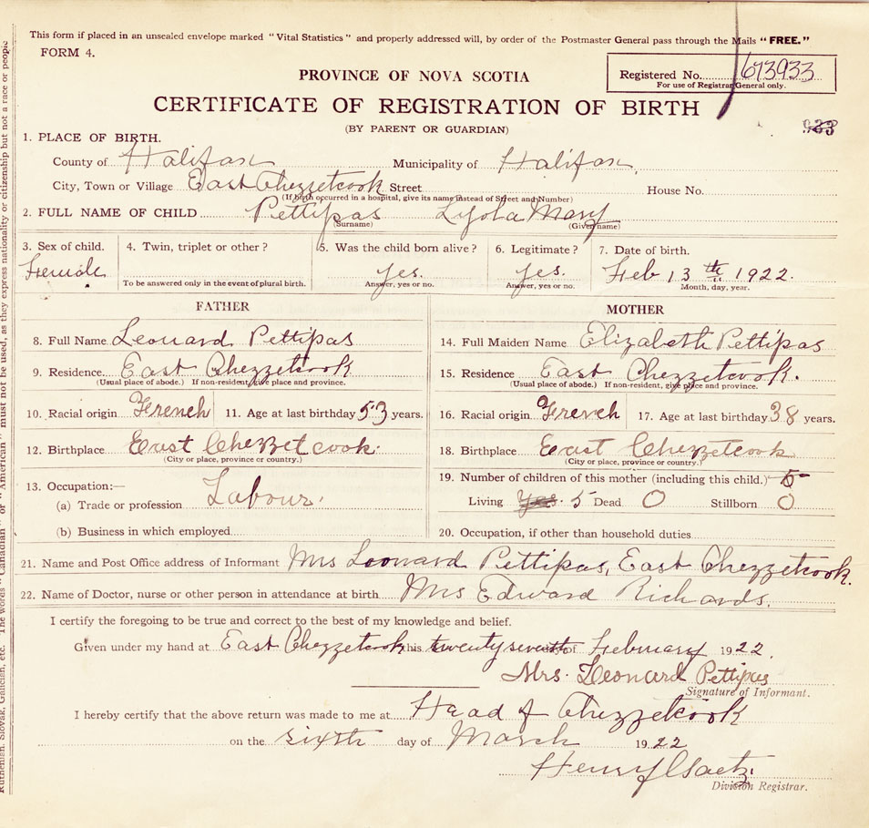 21. Name and Post Office address of Informant Mrs. Leonard Pettipas East Chezzetcook