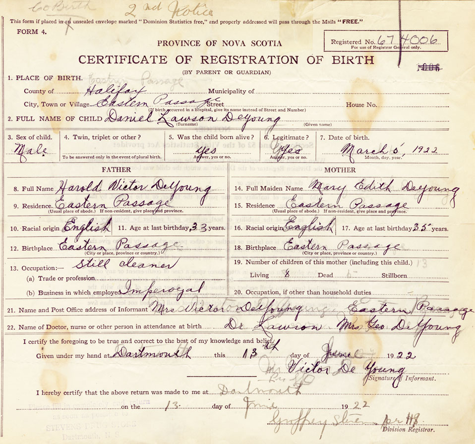 21. Name and Post Office address of Informant Mrs. Victor DeYoung Eastern Passage