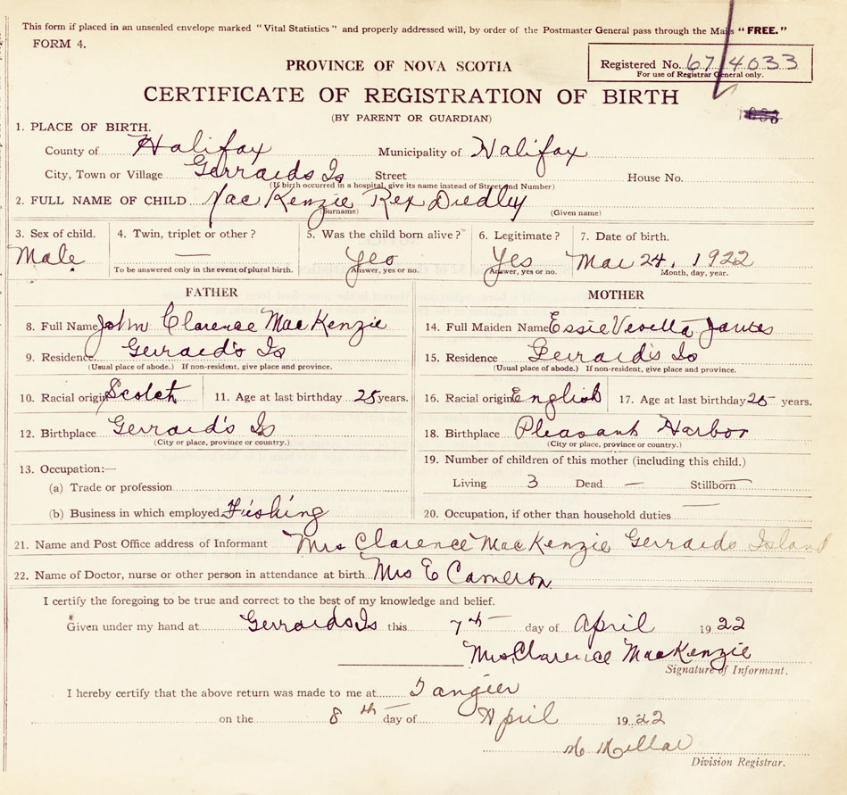 21. Name and Post Office address of Informant Mrs. Clarence MacKenzie Gerrards Island