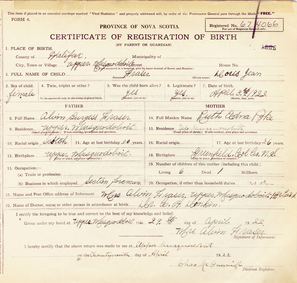 21. Name and Post Office address of Informant Mrs. Alvin Fraser Upper Musquodoboit