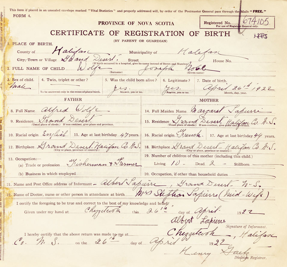 22. Name of Doctor, nurse or other person in attendance at birth Mrs. Stephen Lapierre (mid-wife)
