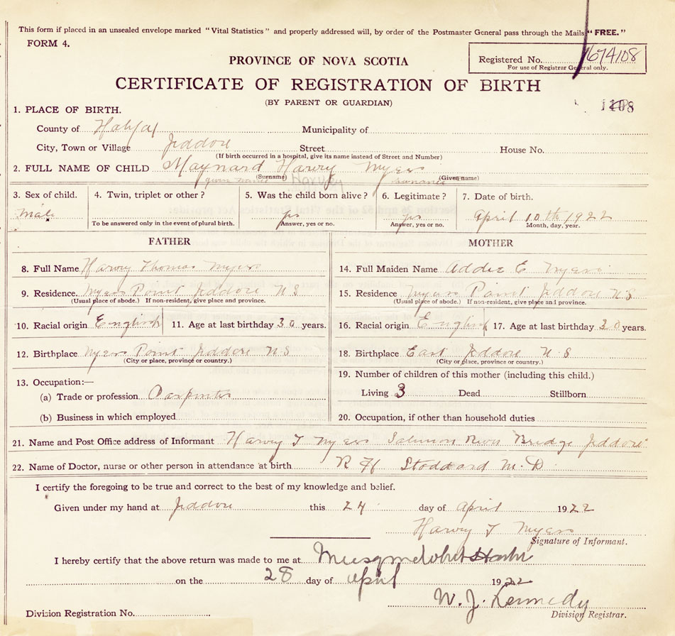 21. Name and Post Office address of Informant Harvey T. Myers Salmon River Bridge, Jeddore