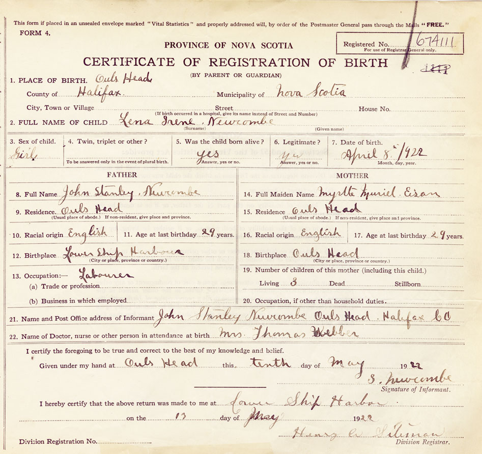 Female Birth Registration: Year: 1922 number: 67400111