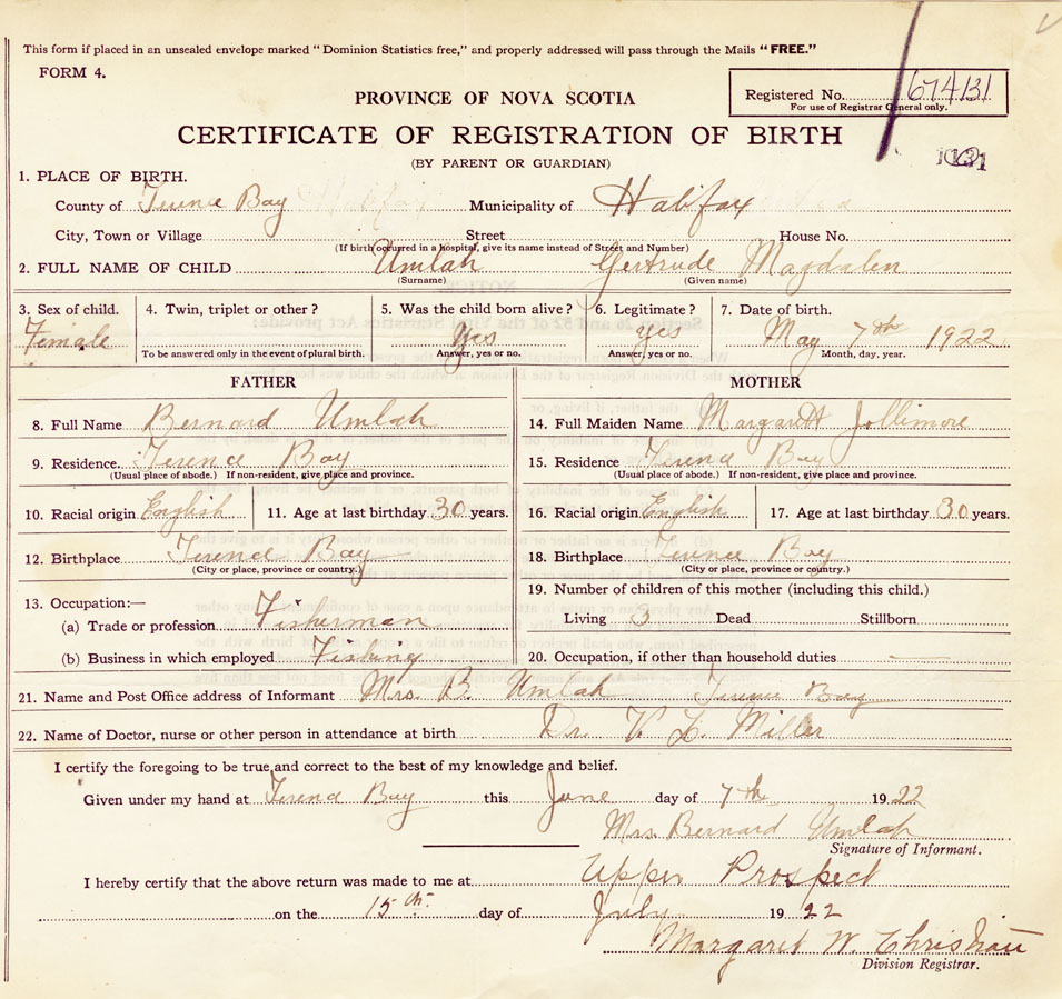 21. Name and Post Office address of Informant Mrs. B. Umlah Terrence Bay