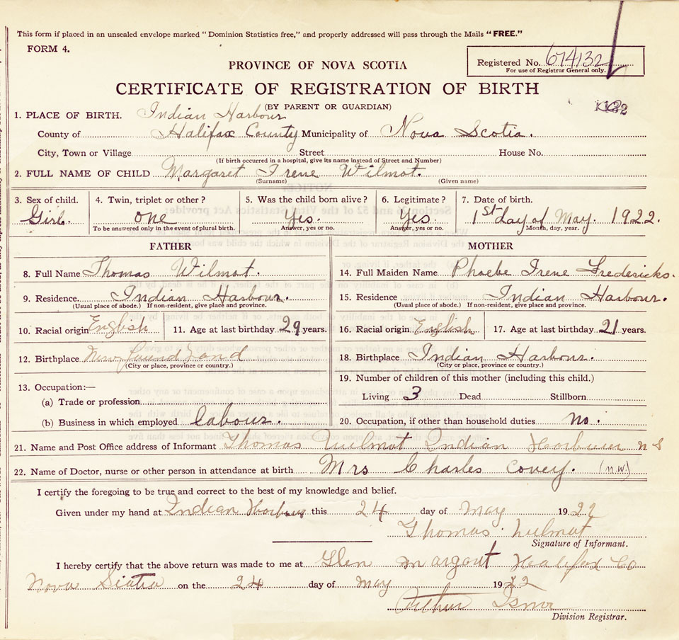 21. Name and Post Office address of Informant Thomas Wilmot Indian Harbour