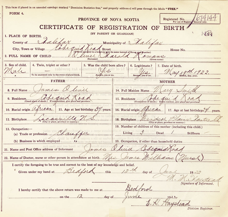 21. Name and Post Office address of Informant James Oliver Cobequid Road