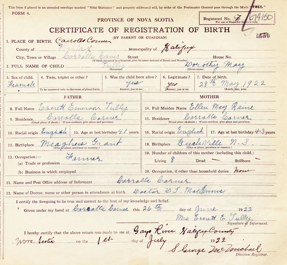 22. Name of Doctor, nurse or other person in attendance at birth Dr. D.J. MacInnis