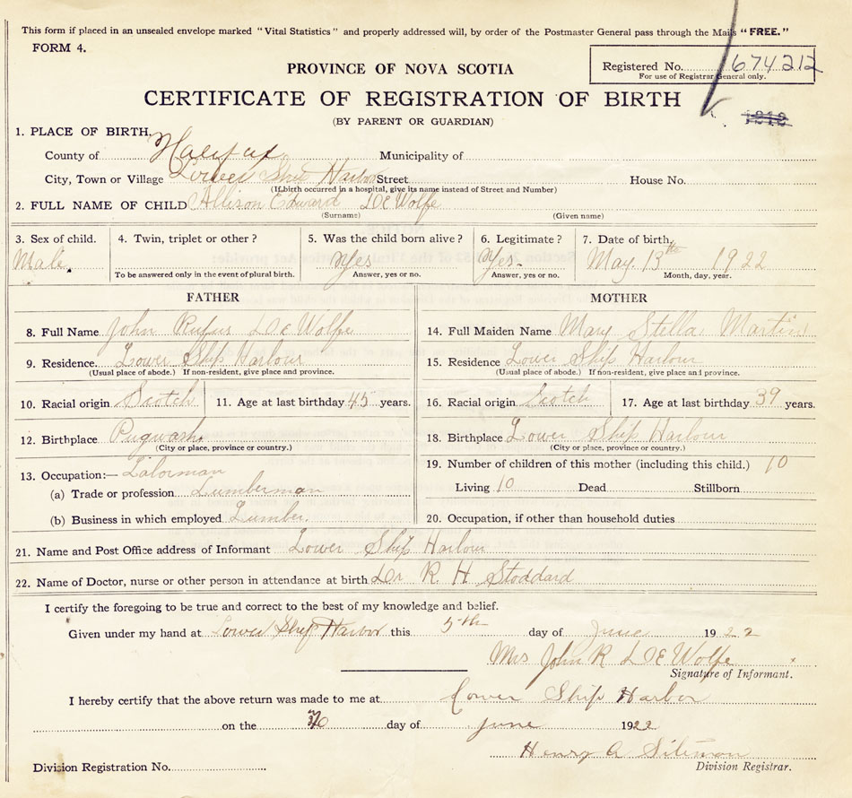 21. Name and Post Office address of Informant Mrs. John r. DeWolfe Lower Ship Harbour