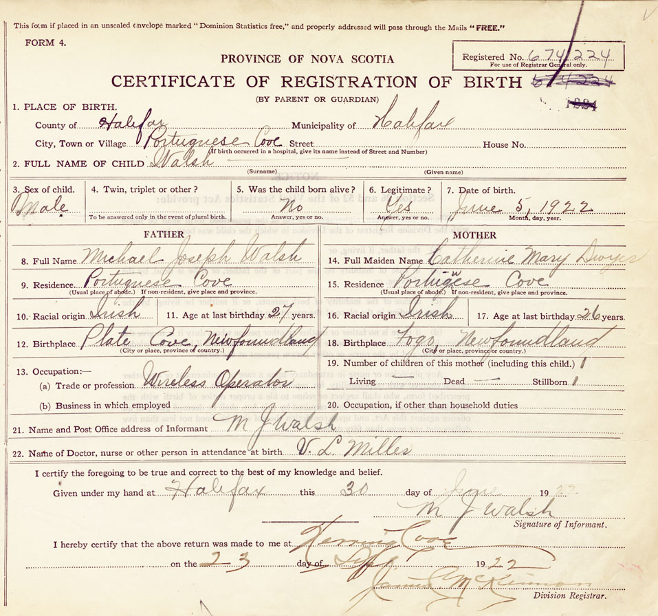 Male Birth Registration: Year: 1922 number: 67400224