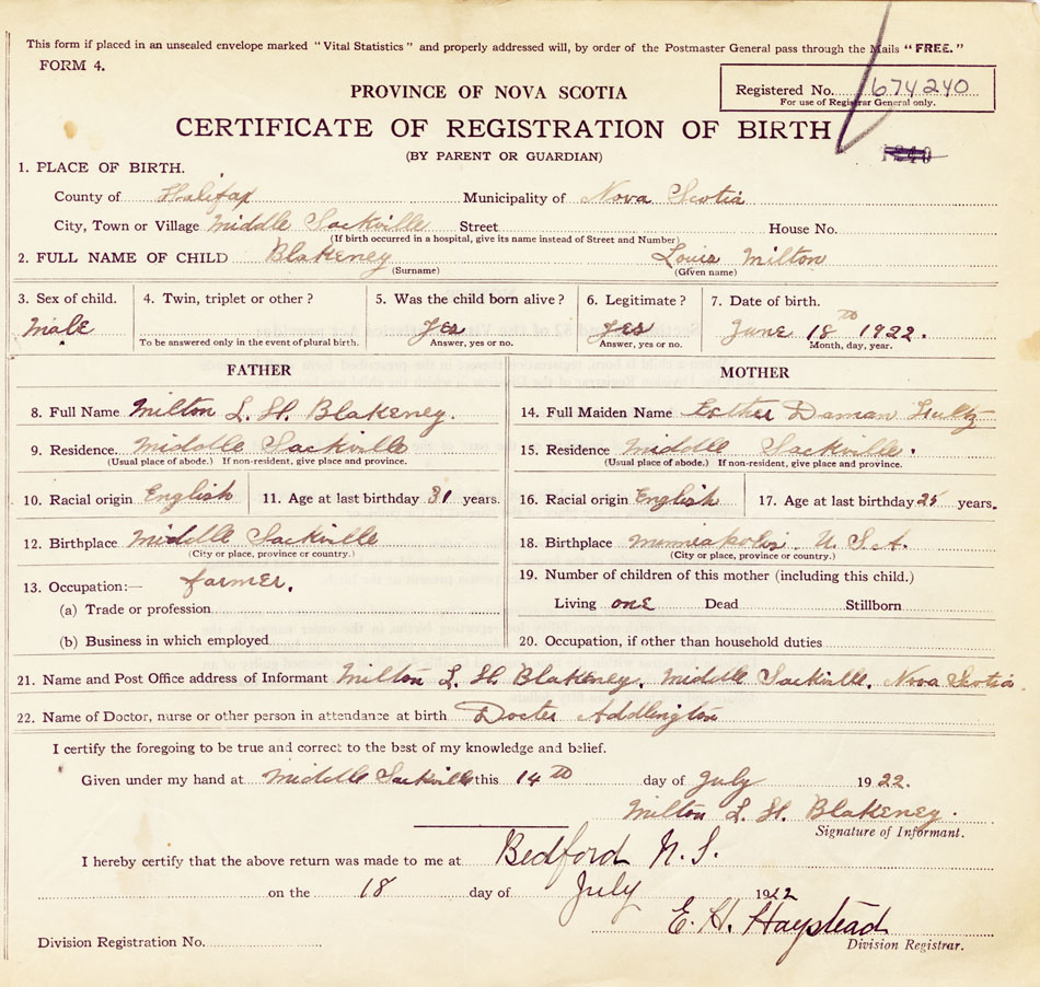 21. Name and Post Office address of Informant Milton L.H. Blakeley Middle Sackville