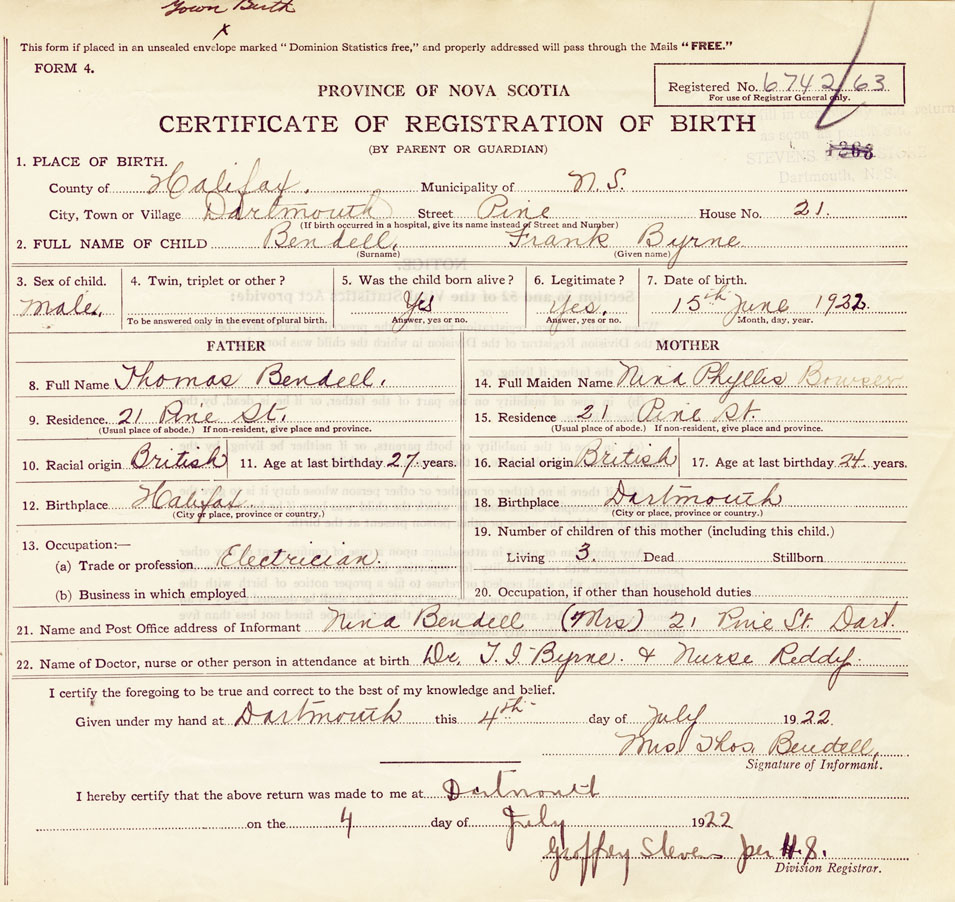 22. Name of Doctor, nurse or other person in attendance at birth Dr. T.J. Byrne and Nurse Keddy