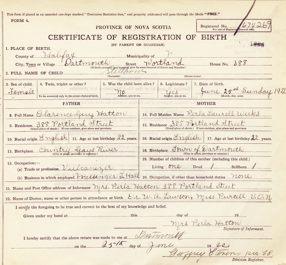 21. Name and Post Office address of Informant Mrs. Perla Hatton 388 Portland St. Dartmouth
