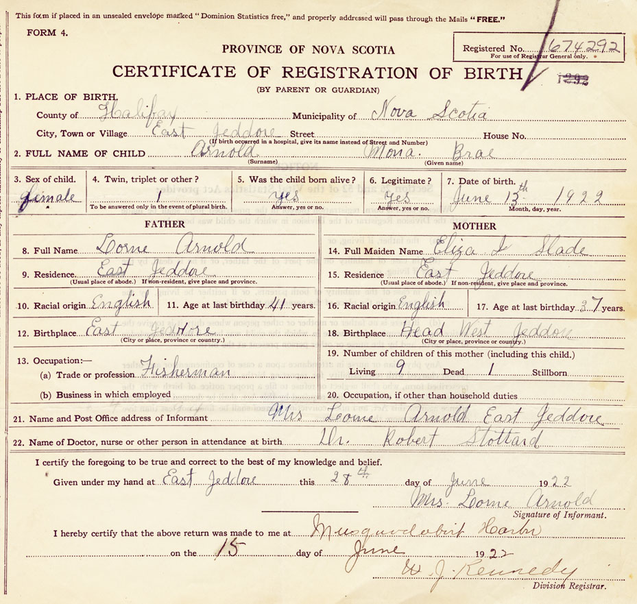 21. Name and Post Office address of Informant Mrs. Lorne Arnold East Jeddore