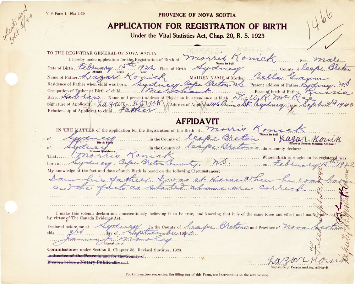 I hereby make application for the Registration of Birth of MorrisKonick Sex Male