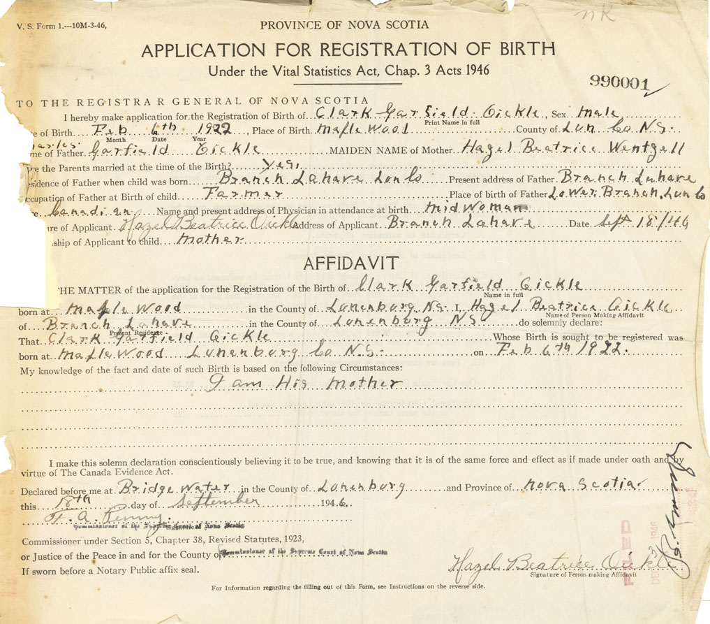 I hereby make application for the Registration of Birth of Clark GarfieldOickle Sex Male