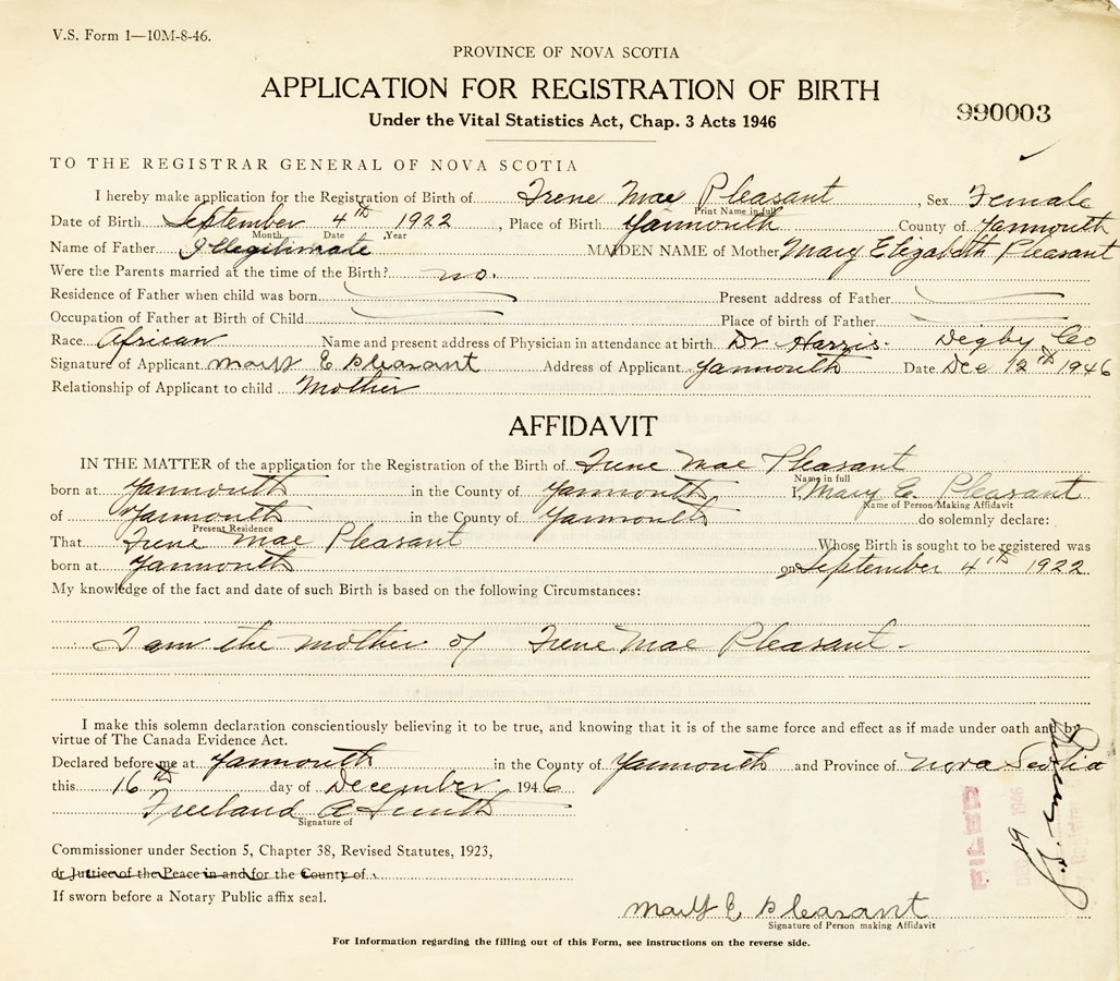 IN THE MATTER of the application for the Registration of the Birth of Irene MaePleasant