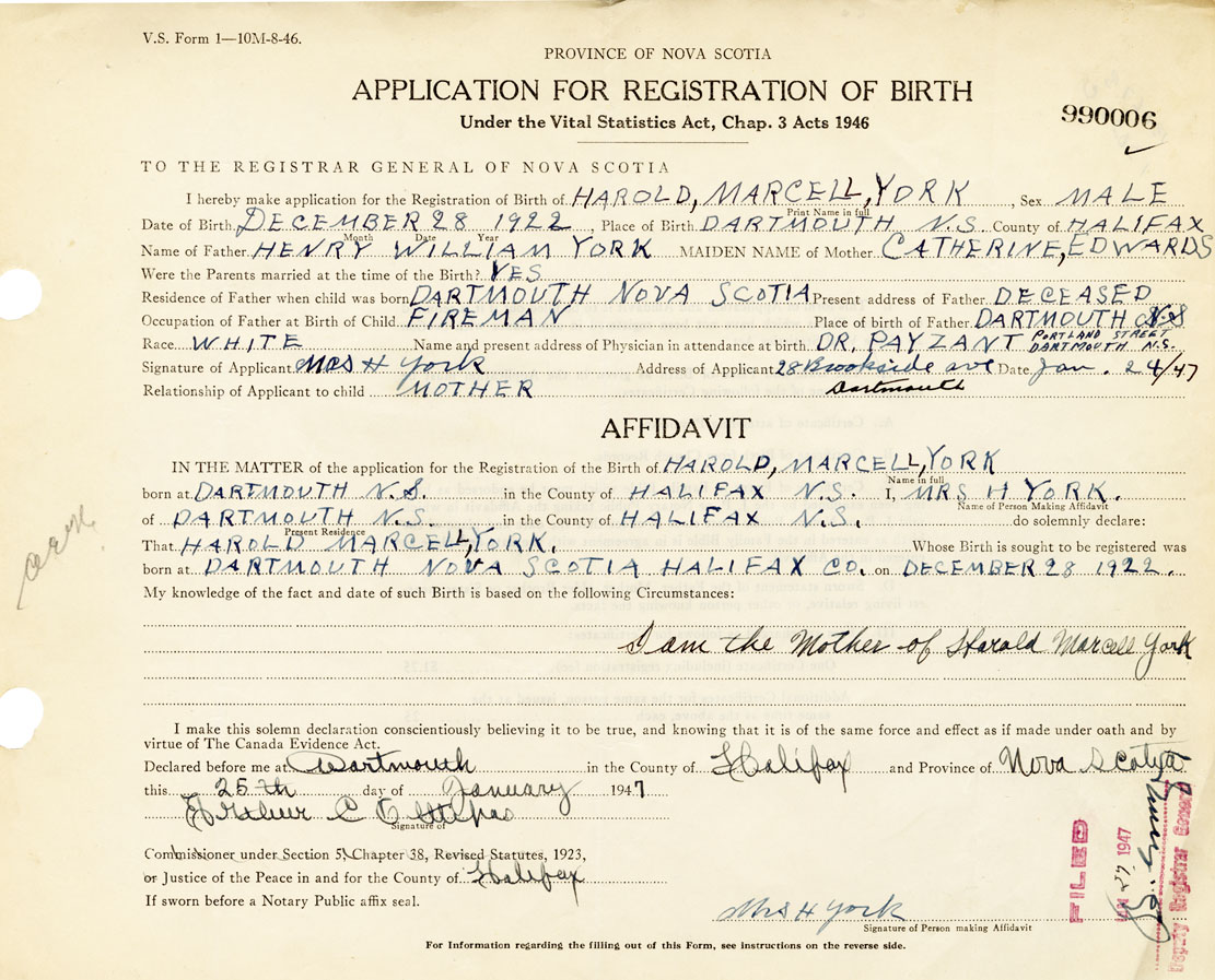 I hereby make application for the Registration of Birth of Harold MarcellYork Sex Male
