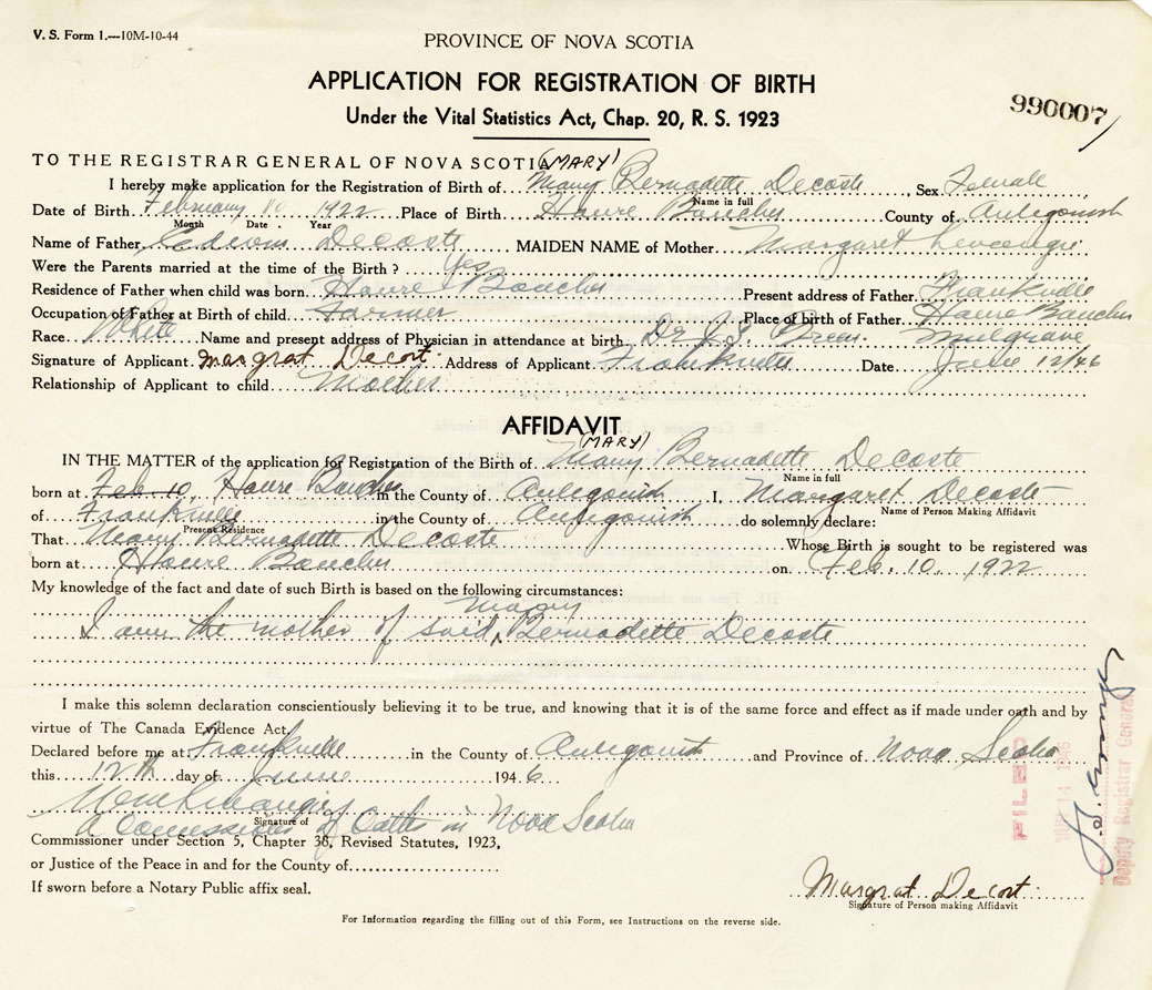 I hereby make application for the Registration of Birth of Mary BernadetteDecoste Sex Female
