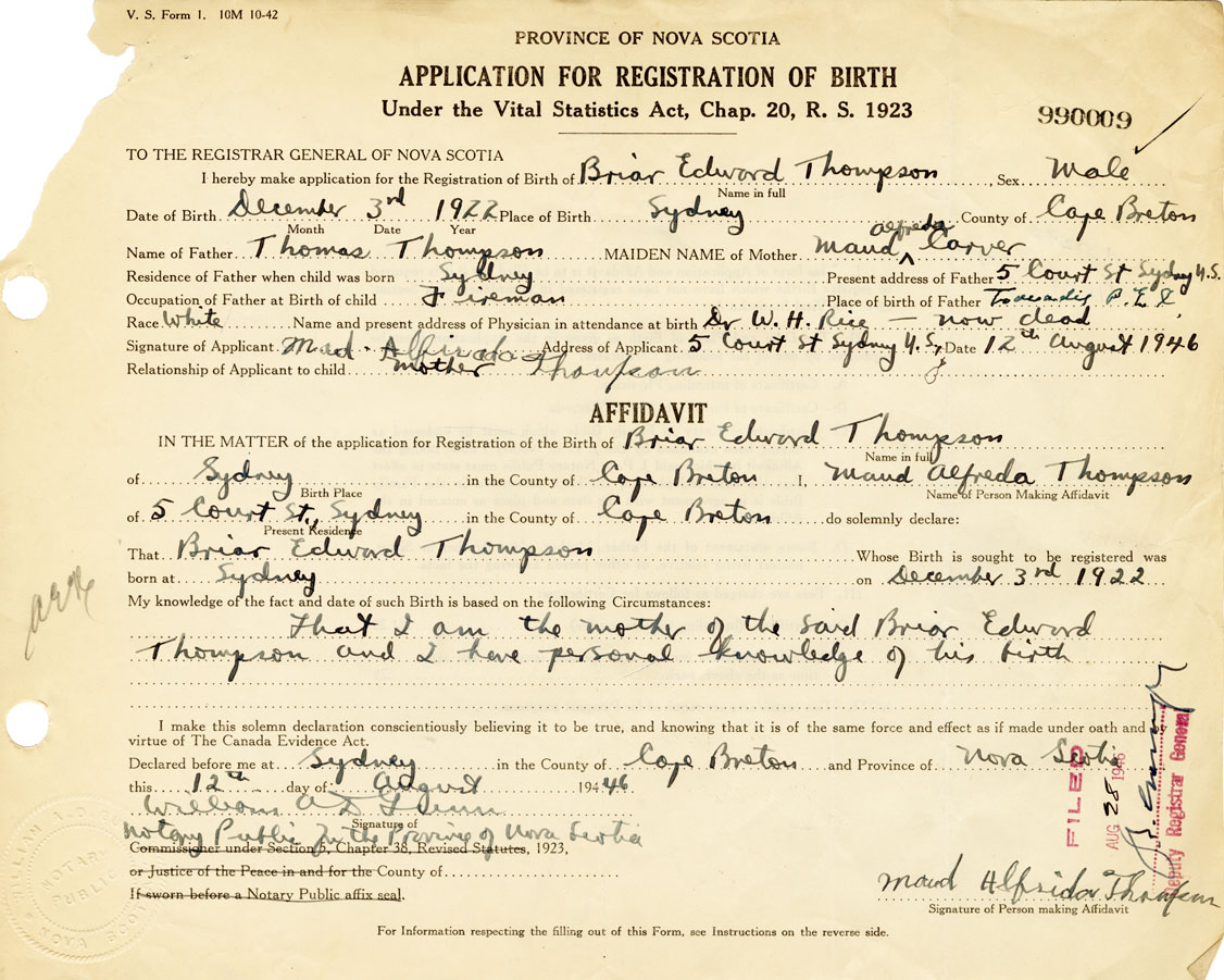 Signature of Applicant Maud Alfreda Thompson Address of Applicant 5 Court Street, Sydney, Cape Breton Date 12 August 1946