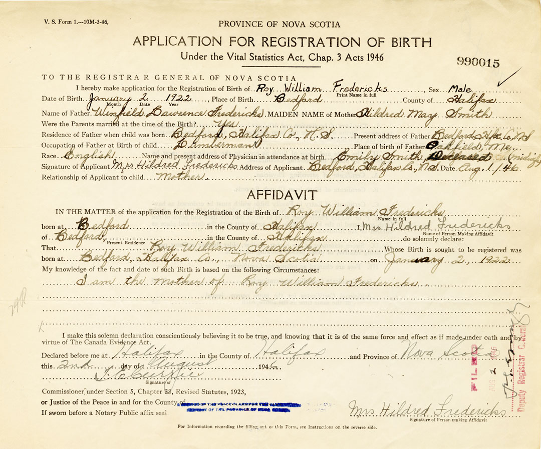 Signature of Applicant Mrs. Hildred Fredericks Address of Applicant Bedford, Halifax Date 1 August 1946