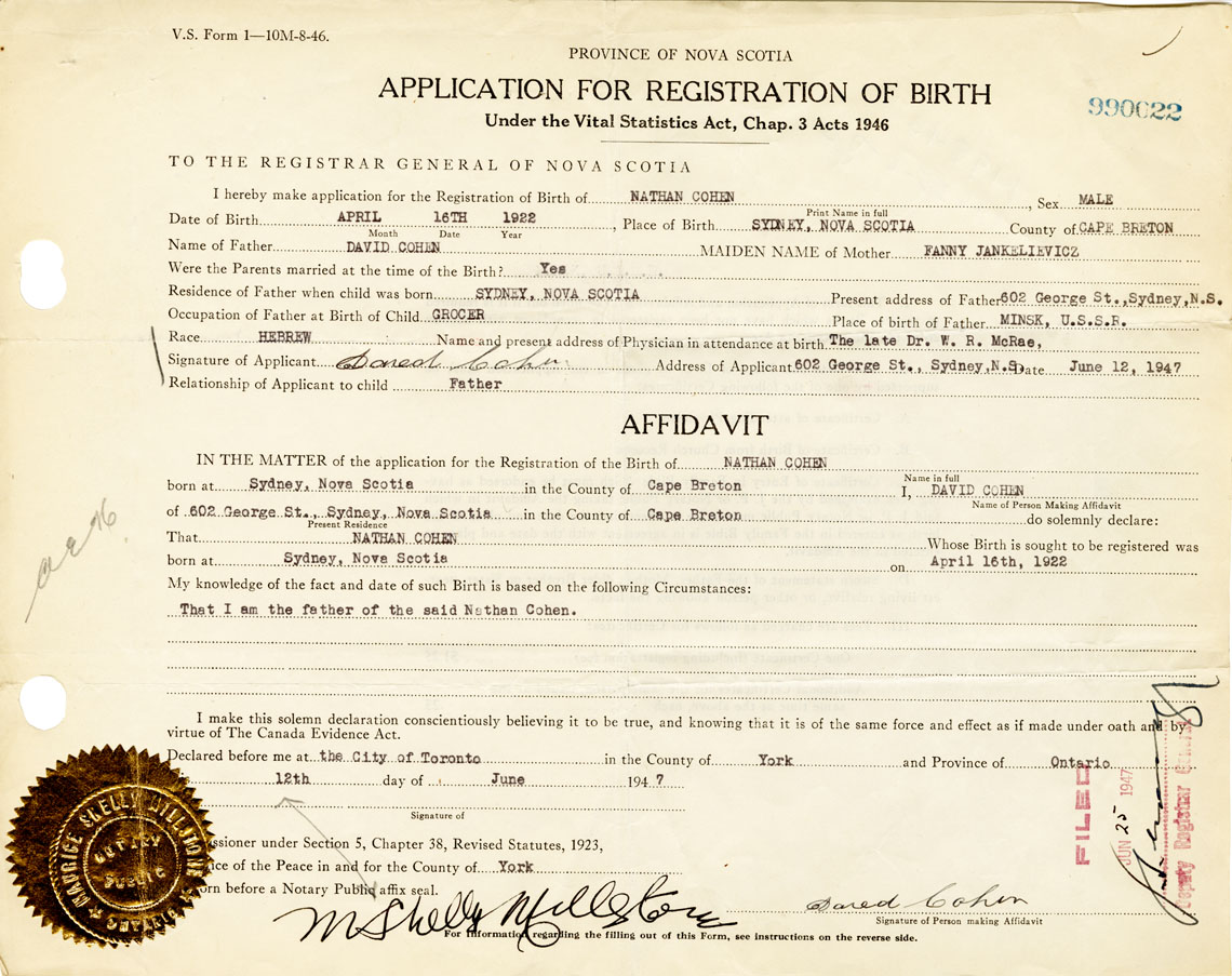 Signature of Applicant David Cohen Address of Applicant 602 George Street, Sydney, Cape Breton Date 12 June 1947