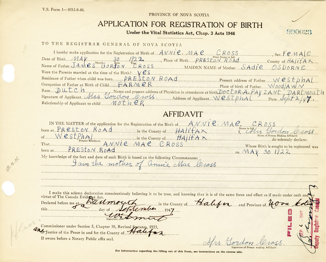 Date of Birth May 30, 1922 Place of Birth Preston RoadCounty of Halifax