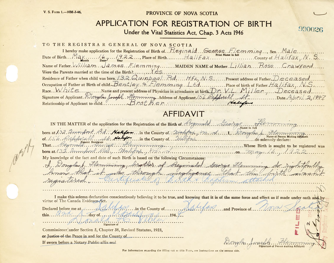 I hereby make application for the Registration of Birth of Reginald GeorgeFlemming Sex Male