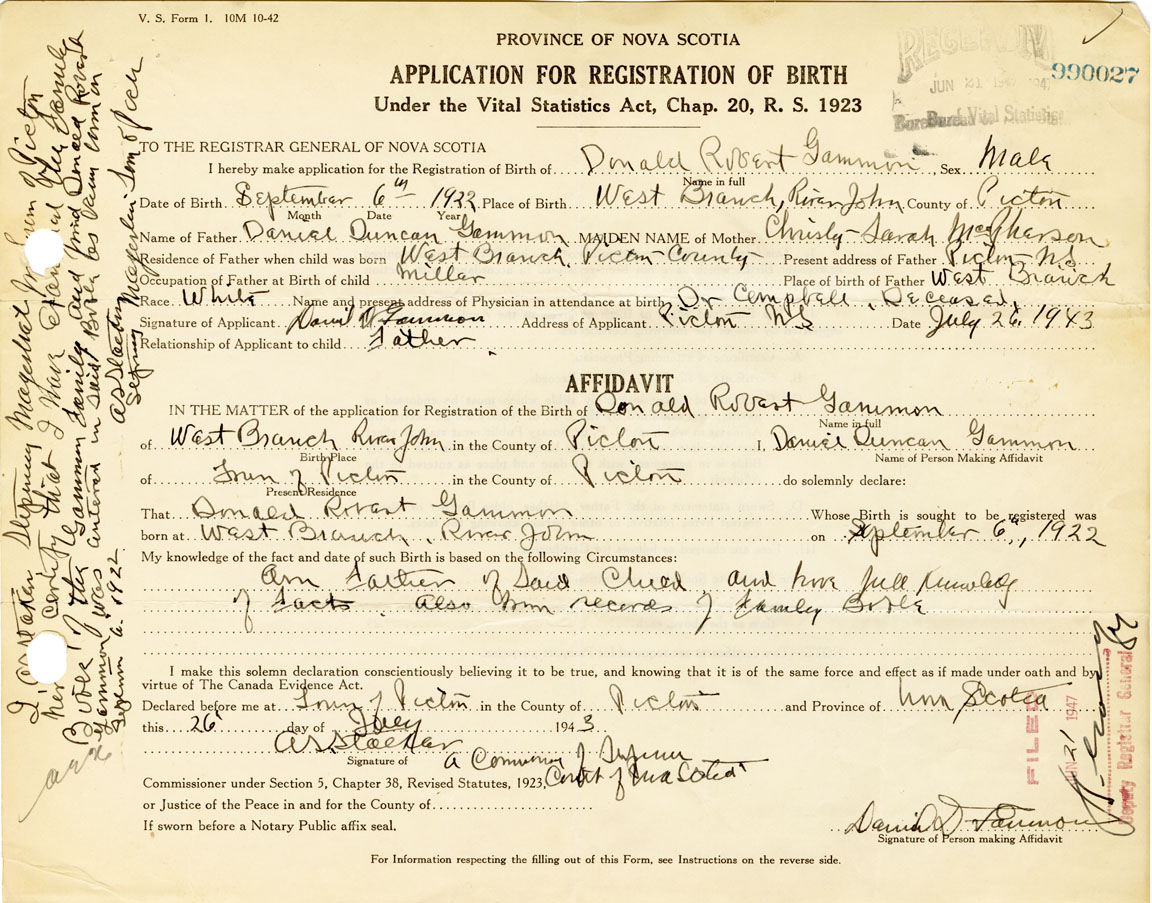 Signature of Applicant David D. Gammon Address of Applicant Pictou Date 26 July 1943