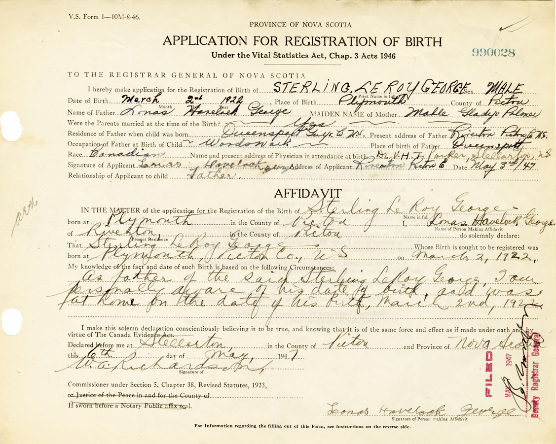 Signature of Applicant Lonas Havelock George Address of Applicant Riverton, Pictou Date 3 May 1947