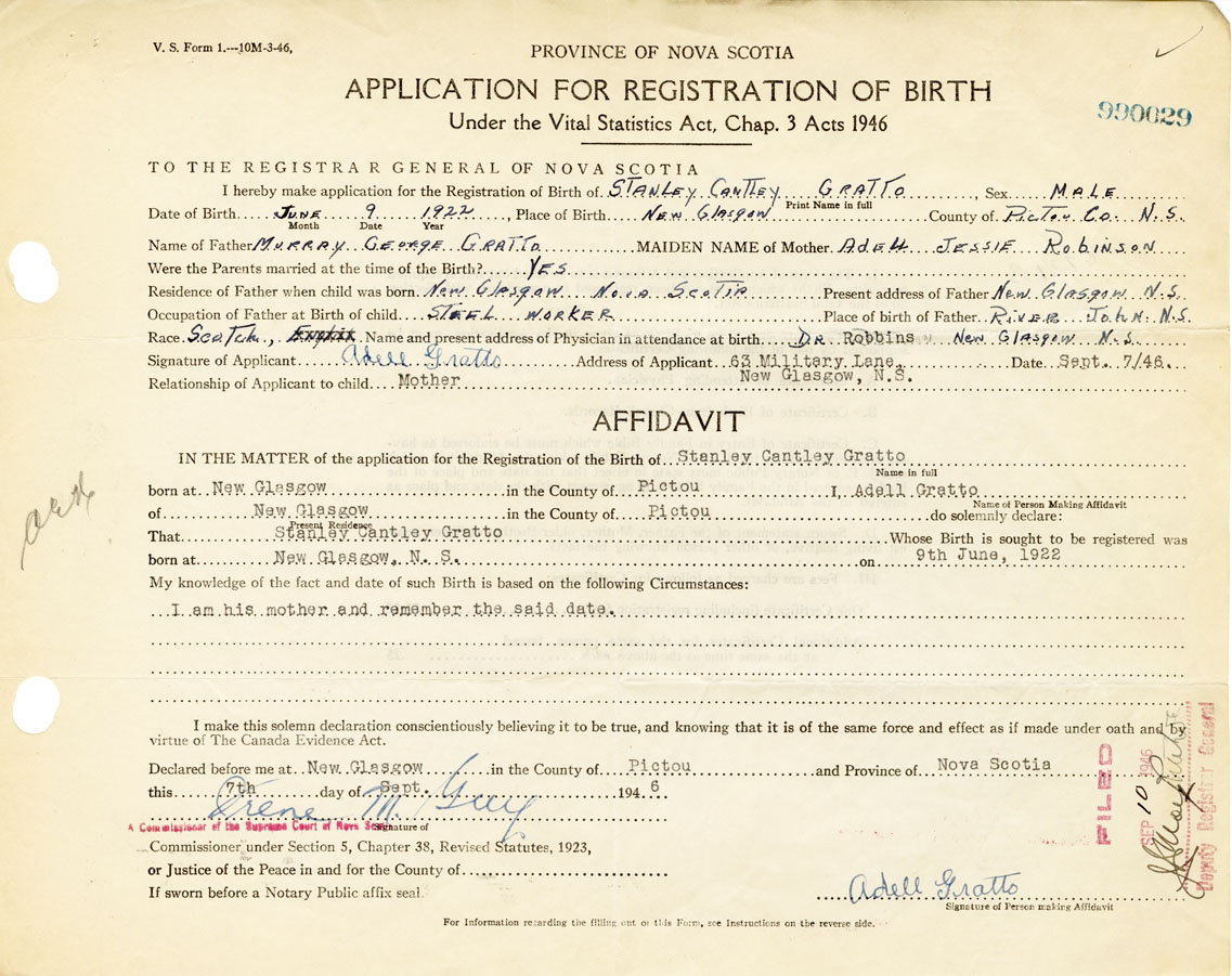 Signature of Applicant Adell Gratto Address of Applicant 63 Military Lane, New Glasgow, Pictou Date 7 September 1946