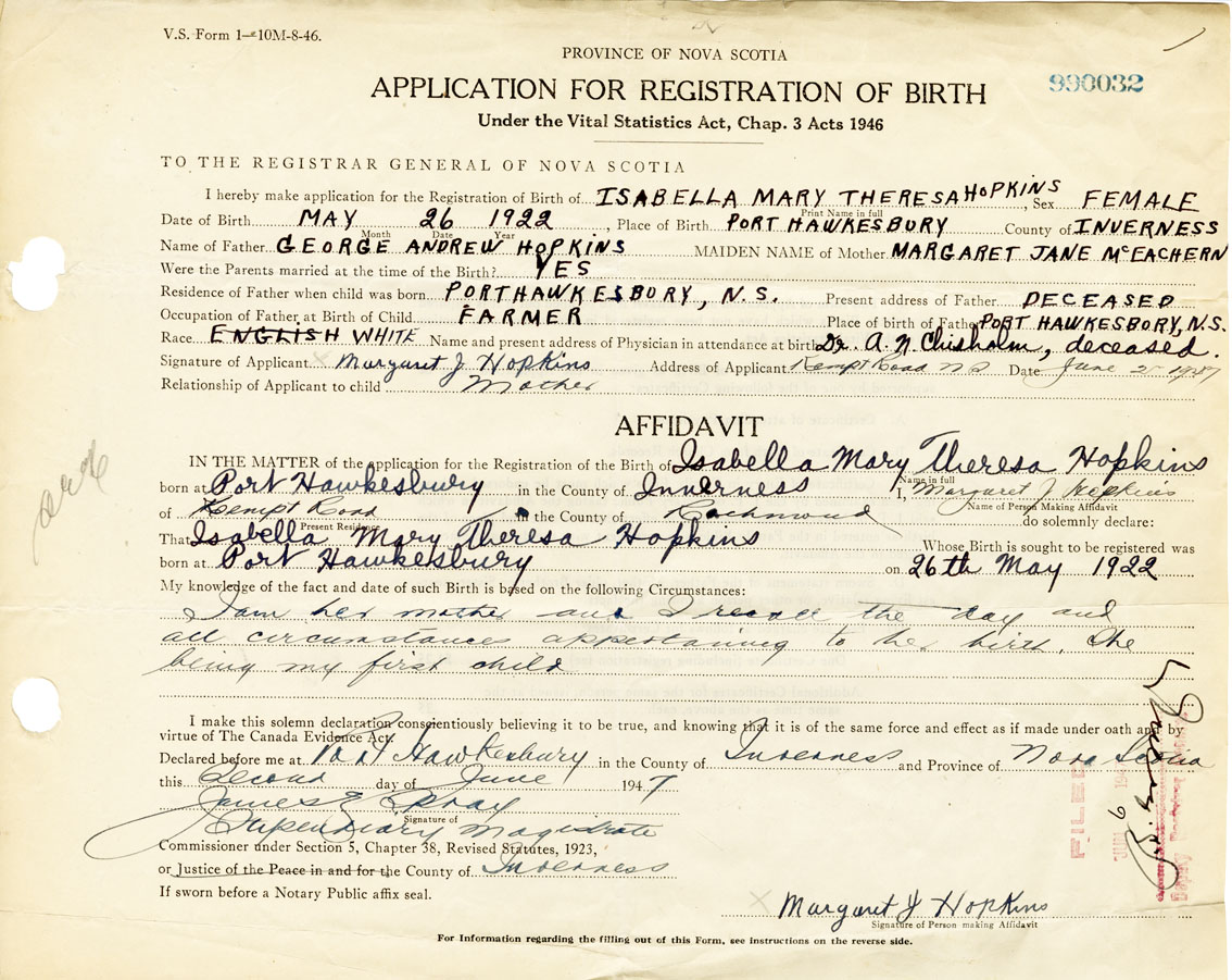 Date of Birth May 26, 1922 Place of Birth Port HawkesburyCounty of Inverness