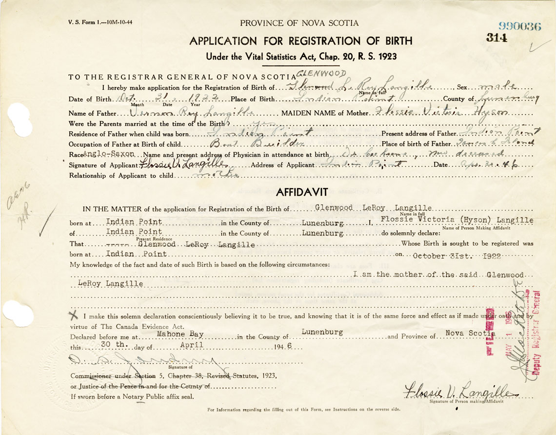 I hereby make application for the Registration of Birth of Glenwood LeRoyLangille Sex Male