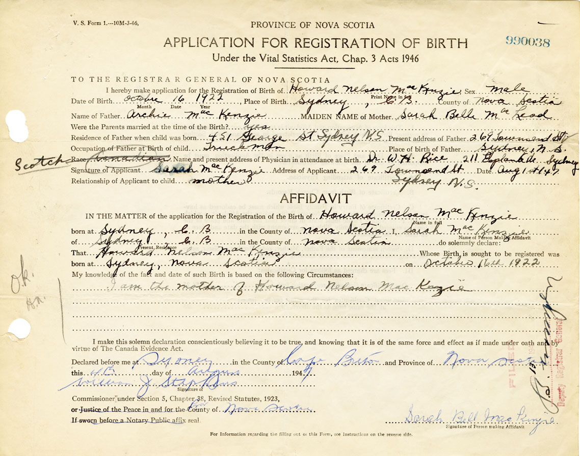 I hereby make application for the Registration of Birth of Howard NelsonMacKenzie Sex Male