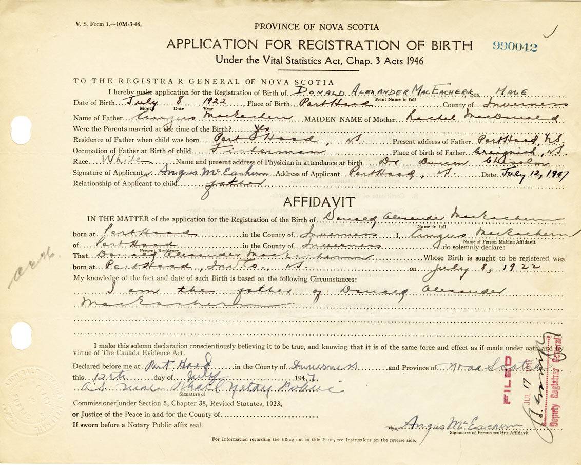 Signature of Applicant Angus MacEachern Address of Applicant Port Hood, Inverness Date 12 July 1947