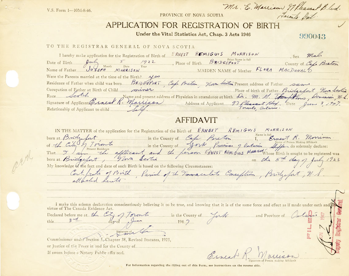Signature of Applicant Ernest R. Morrison Address of Applicant 97 Pleasant Blvd., Toronto, Ontario Date 3 June 1947