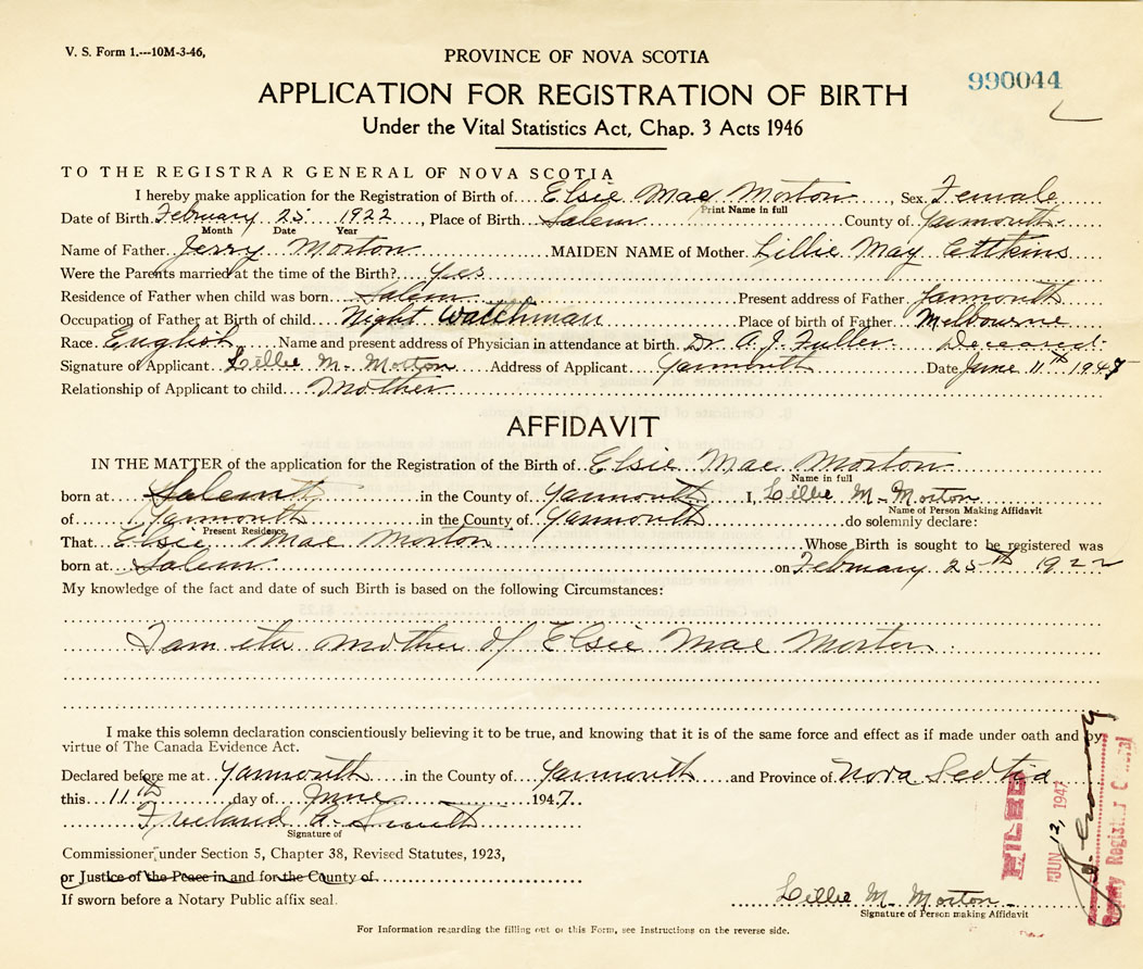 born at Salem Yarmouth County on February 25, 1922