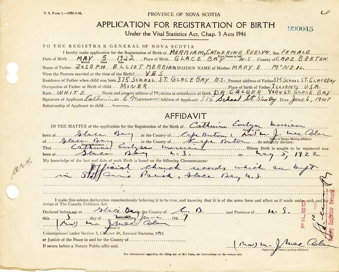 Signature of Applicant Catherine E. Merriam Address of Applicant 375 School Street, Glace Bay, Cape Breton Date 6 June 1947