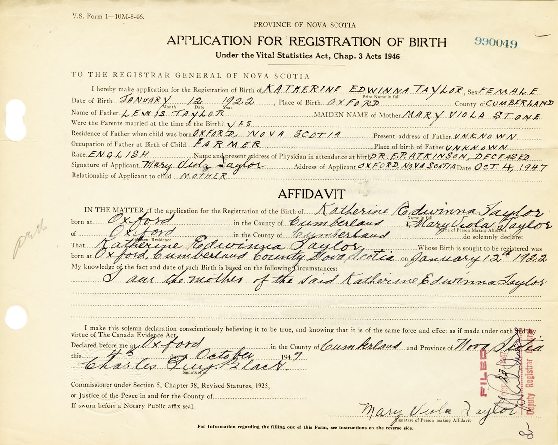 Signature of Applicant Mary Viola Taylor Address of Applicant Oxford, Cumberland Date 4 October 1947