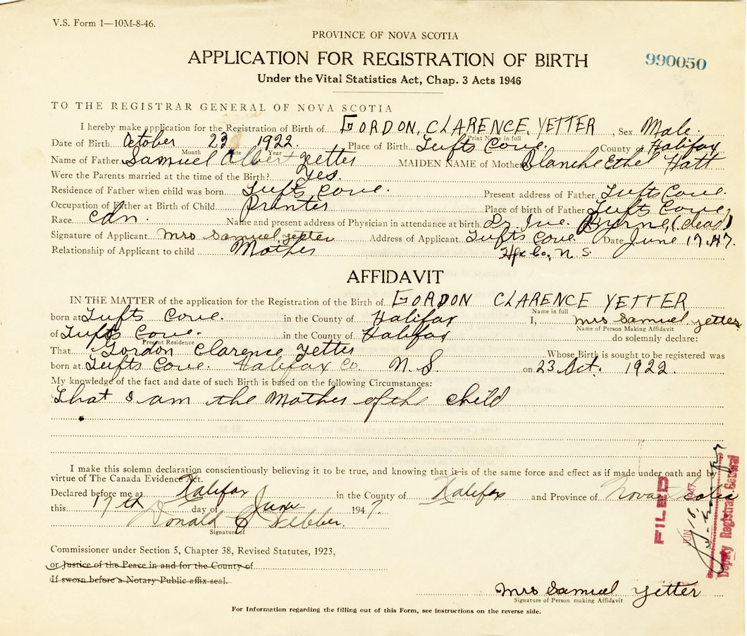 I hereby make application for the Registration of Birth of Gordon ClarenceYetter Sex Male
