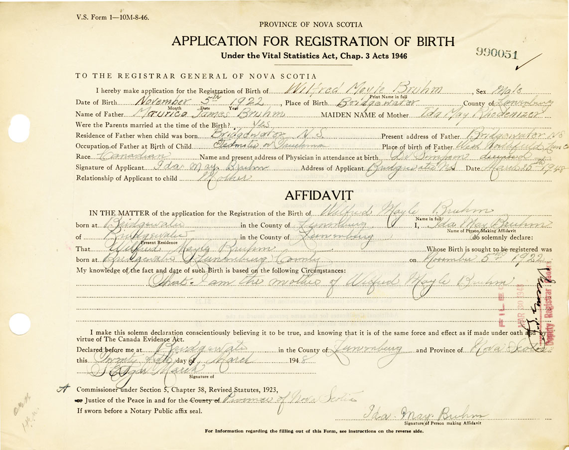 Date of Birth November 5, 1922 Place of Birth BridgewaterCounty of Lunenburg